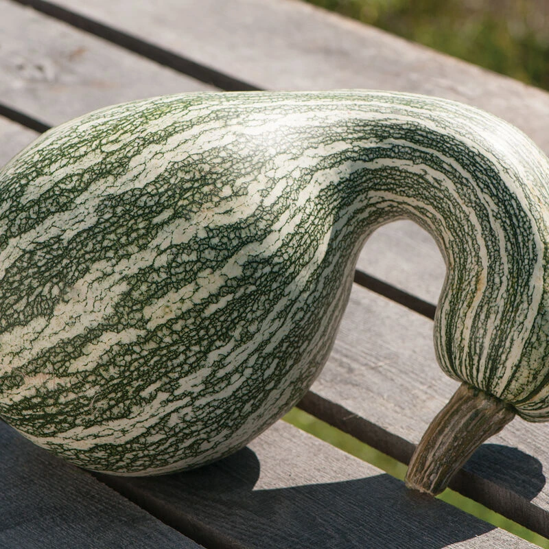 Striking green-and-white-striped fruits avg. 7–25 lb. Great for cooking. Bulbous bottom with tapered neck. Full vine.