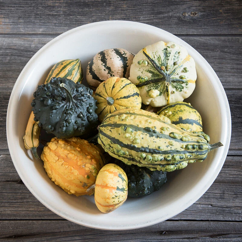 This handsome selection of mixed gourds was developed by Jim Harvey, a grower and Johnny’s customer from Massachusetts. A mix of mostly warted pears, dumplings, patty pans, cheeses, and other shapes in a range of colors. Avg. weight: 8–12 oz. USDA Certified Organic.