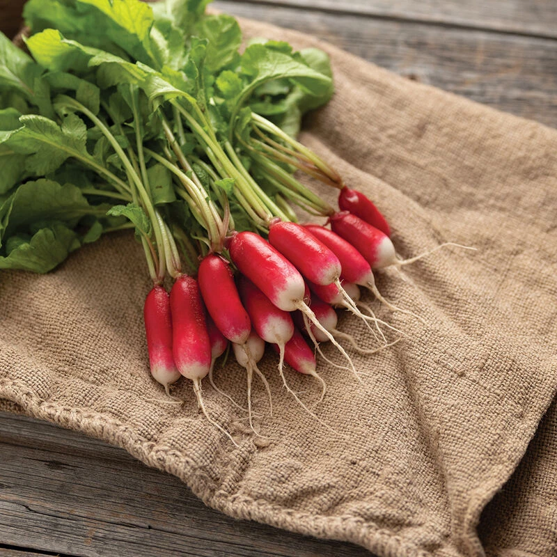 Straight, candy-red roots resist pithiness better than other long French types. Compared to French Breakfast, roots are shorter, wider, and show less white on the tips. Responds better to tight spacing. Improved top strength. NOTE: For longer, straighter roots, sow 15–20% more seeds per row 1/2 to 1 cm deeper, and do not irrigate unless absolutely necessary.