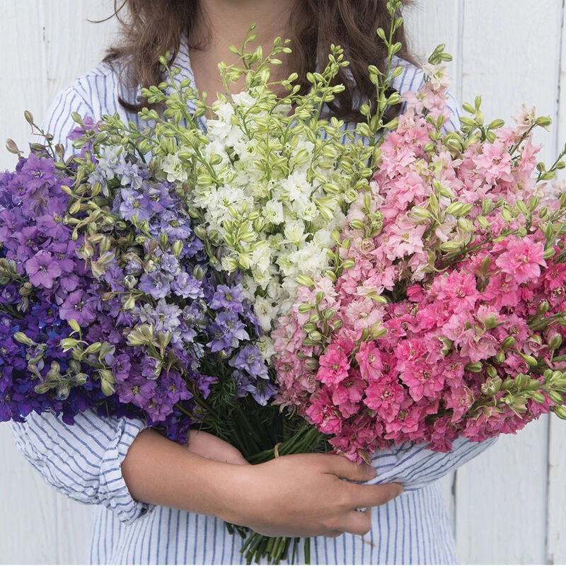 Features tall spires of dense florets. All colors produce double blooms with a small percentage of singles. 1 1/2–1 3/4″ florets on 9–12″ flower spikes. Very similar to the Sublime series, which QIS™ replaced. Mix includes: carmine, dark blue, light blue, light pink, lilac, rose, and white. Mixture is a formula mix, meaning the individual colors are grown and maintained separately and seeds are then mixed together in measured quantities. Attracts hummingbirds.