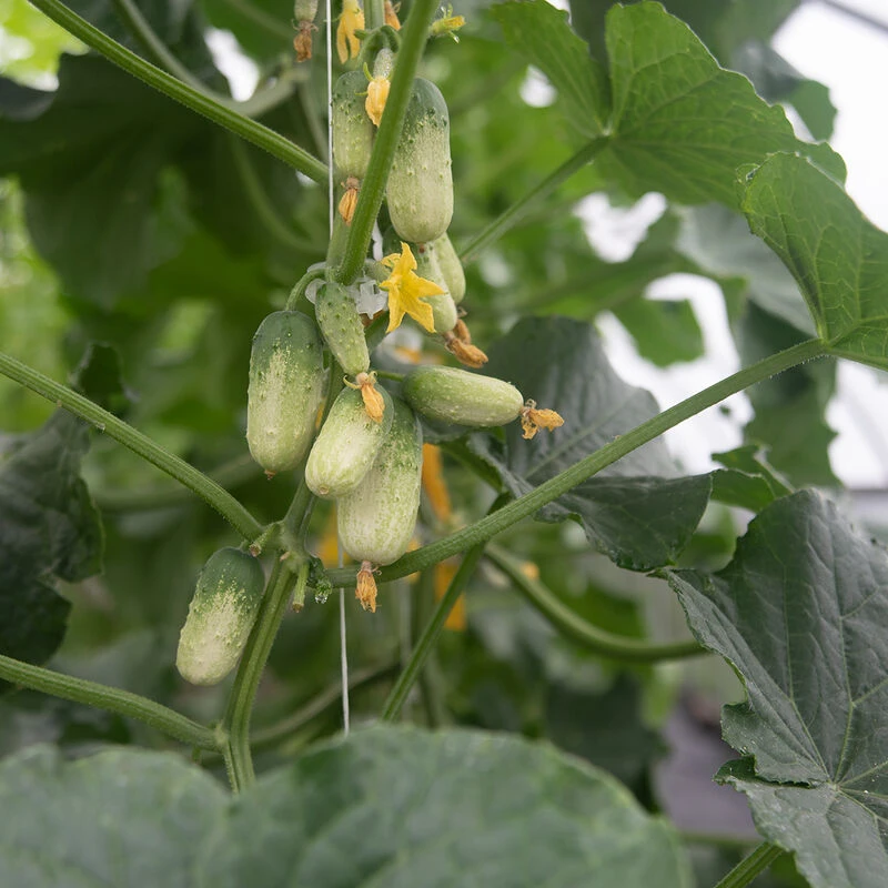 Quirk is an attention-grabbing mini with a striking contrast between bright green and gleaming white. Short vines produce heavy yields of tasty 2–3″ fruits. Performs well in the greenhouse or unpruned, in the field. A good field cucumber because it resists beetle damage very well. Daily harvest is recommended. Gynoecious and parthenocarpic. NOTE: When growing indoors, we recommend Quirk be trained on Hortonova trellis with multiple leaders. Pruning to a single leader will reduce yield potential, and typical long-vine cucumbers may shade out Quirk if grown too close.